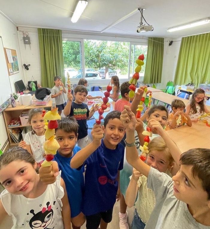 Els alumnes de 1r, 2n i 3r de primària van portar fruita preparada de casa, i els alumnes de 4rt, 5è i 6è, la van prepar a l’escola. Quan a classe van acabar de fer les broquetes, van sortir al pati.